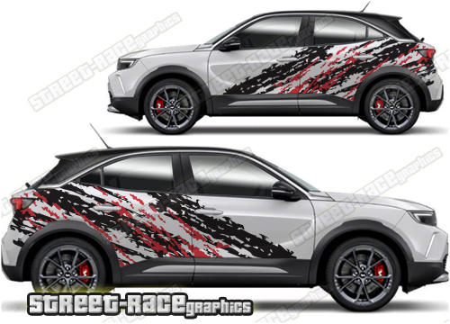 Vauxhall Mokka graphics. They are shown on the first generation Mokka but they can be trimmed to fit all later versions and facelift variants. The decals are not pre-cut for any specific Vauxhall Mokka version; they do not have any door handle cutouts, wheel arch or door line splits. These will require trimming during fitting. Vinyl will not stick to unpainted textured plastics.
