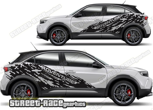 Vauxhall Mokka graphics. They are shown on the first generation Mokka but they can be trimmed to fit all later versions and facelift variants. The decals are not pre-cut for any specific Vauxhall Mokka version; they do not have any door handle cutouts, wheel arch or door line splits. These will require trimming during fitting. Vinyl will not stick to unpainted textured plastics.