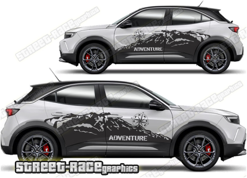 Vauxhall Mokka graphics. They are shown on the first generation Mokka but they can be trimmed to fit all later versions and facelift variants. The decals are not pre-cut for any specific Vauxhall Mokka version; they do not have any door handle cutouts, wheel arch or door line splits. These will require trimming during fitting. Vinyl will not stick to unpainted textured plastics.
