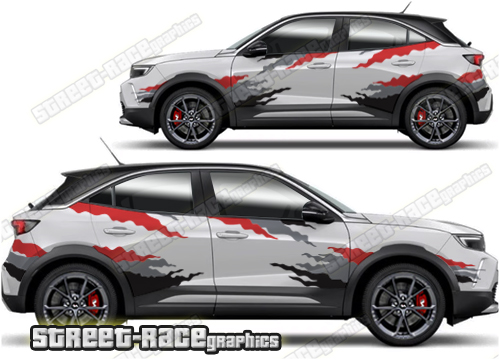 Vauxhall Mokka graphics. They are shown on the first generation Mokka but they can be trimmed to fit all later versions and facelift variants. The decals are not pre-cut for any specific Vauxhall Mokka version; they do not have any door handle cutouts, wheel arch or door line splits. These will require trimming during fitting. Vinyl will not stick to unpainted textured plastics.