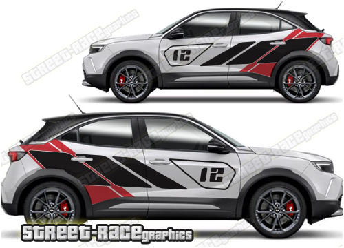 Vauxhall Mokka graphics. They are shown on the first generation Mokka but they can be trimmed to fit all later versions and facelift variants. The decals are not pre-cut for any specific Vauxhall Mokka version; they do not have any door handle cutouts, wheel arch or door line splits. These will require trimming during fitting. Vinyl will not stick to unpainted textured plastics.