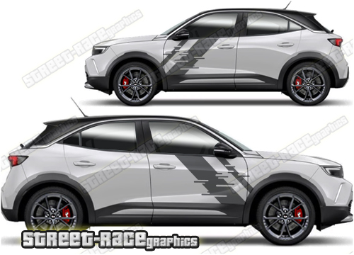 Vauxhall Mokka graphics. They are shown on the first generation Mokka but they can be trimmed to fit all later versions and facelift variants. The decals are not pre-cut for any specific Vauxhall Mokka version; they do not have any door handle cutouts, wheel arch or door line splits. These will require trimming during fitting. Vinyl will not stick to unpainted textured plastics.