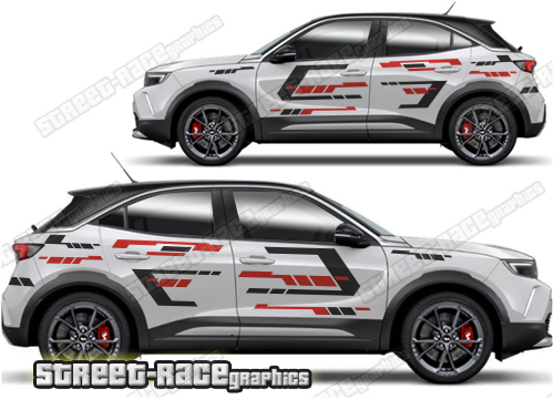 Vauxhall Mokka graphics. They are shown on the first generation Mokka but they can be trimmed to fit all later versions and facelift variants. The decals are not pre-cut for any specific Vauxhall Mokka version; they do not have any door handle cutouts, wheel arch or door line splits. These will require trimming during fitting. Vinyl will not stick to unpainted textured plastics.