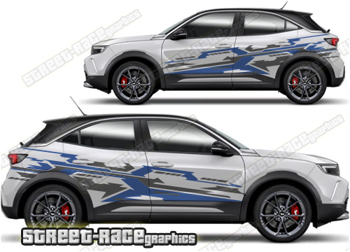 Vauxhall Mokka graphics. They are shown on the first generation Mokka but they can be trimmed to fit all later versions and facelift variants. The decals are not pre-cut for any specific Vauxhall Mokka version; they do not have any door handle cutouts, wheel arch or door line splits. These will require trimming during fitting. Vinyl will not stick to unpainted textured plastics.