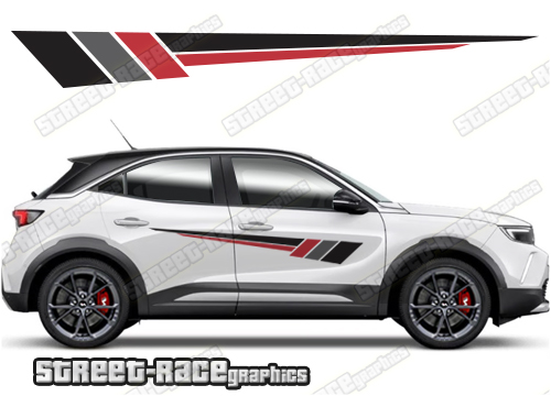 Vauxhall Mokka racing stripes. They are shown on the first generation Mokka but they can be trimmed to fit all later versions and facelift variants. The decals are not pre-cut for any specific Vauxhall Mokka version; they do not have any door handle cutouts, wheel arch or door line splits. These will require trimming during fitting. Vinyl will not stick to unpainted textured plastics.