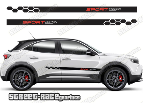 Vauxhall Mokka racing stripes. They are shown on the first generation Mokka but they can be trimmed to fit all later versions and facelift variants. The decals are not pre-cut for any specific Vauxhall Mokka version; they do not have any door handle cutouts, wheel arch or door line splits. These will require trimming during fitting. Vinyl will not stick to unpainted textured plastics.