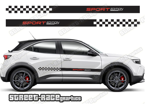 Vauxhall Mokka racing stripes. They are shown on the first generation Mokka but they can be trimmed to fit all later versions and facelift variants. The decals are not pre-cut for any specific Vauxhall Mokka version; they do not have any door handle cutouts, wheel arch or door line splits. These will require trimming during fitting. Vinyl will not stick to unpainted textured plastics.