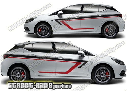 Vauxhall / Opel Astra graphics. These large race-inspired decals are perfect for both street, rally and track-day cars. They are a universal fit to suit all Vauxhall / Opel Astra cars and facelift variants from MK1 onwards. There are no cutouts for the door handles, wheel arches or door lines; these will require trimming during fitting.