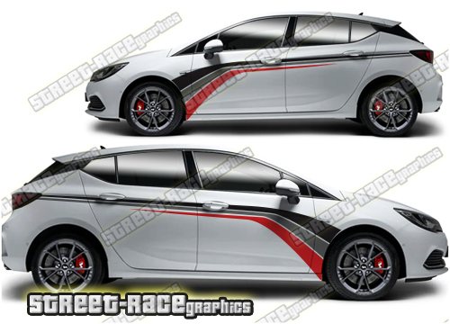 Vauxhall / Opel Astra graphics. These large race-inspired decals are perfect for both street, rally and track-day cars. They are a universal fit to suit all Vauxhall / Opel Astra cars and facelift variants from MK1 onwards. There are no cutouts for the door handles, wheel arches or door lines; these will require trimming during fitting.