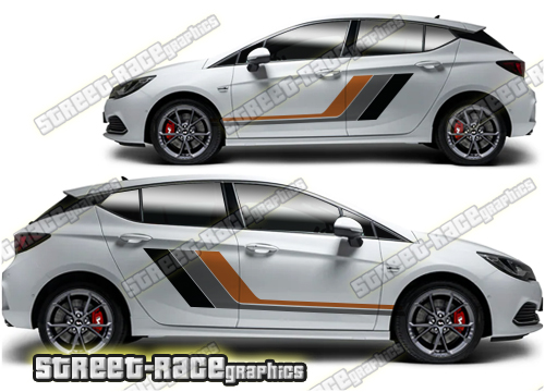 Vauxhall / Opel Astra graphics. These large race-inspired decals are perfect for both street, rally and track-day cars. They are a universal fit to suit all Vauxhall / Opel Astra cars and facelift variants from MK1 onwards. There are no cutouts for the door handles, wheel arches or door lines; these will require trimming during fitting.