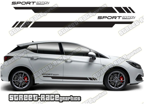 Vauxhall / Opel Astra racing stripes. They are a universal fit to suit all Vauxhall / Opel Astra cars and facelift variants. There are no cutouts for the wheel arches or door lines; these will require trimming during fitting.
