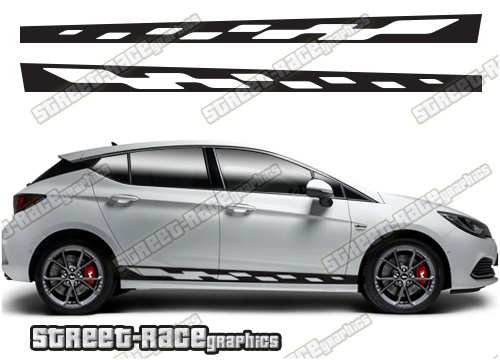 Vauxhall / Opel Astra racing stripes. They are a universal fit to suit all Vauxhall / Opel Astra cars and facelift variants. There are no cutouts for the wheel arches or door lines; these will require trimming during fitting.