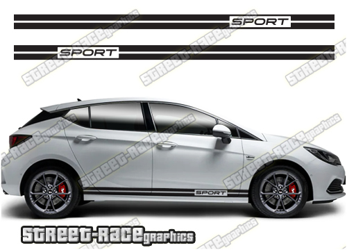Vauxhall / Opel Astra racing stripes. They are a universal fit to suit all Vauxhall / Opel Astra cars and facelift variants. There are no cutouts for the wheel arches or door lines; these will require trimming during fitting.