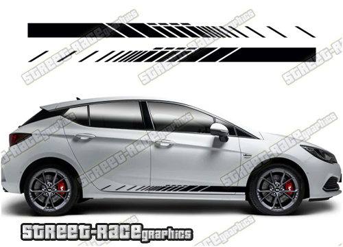 Vauxhall / Opel Astra racing stripes. They are a universal fit to suit all Vauxhall / Opel Astra cars and facelift variants. There are no cutouts for the wheel arches or door lines; these will require trimming during fitting.