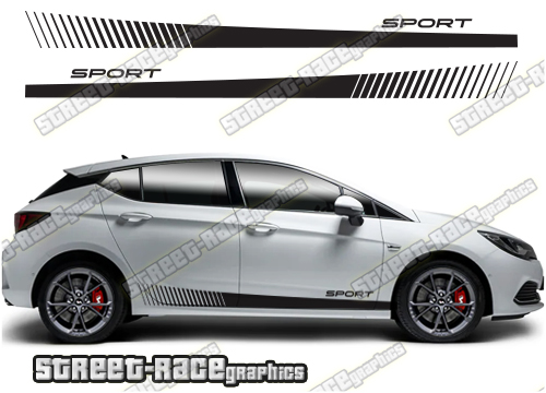 Vauxhall / Opel Astra racing stripes. They are a universal fit to suit all Vauxhall / Opel Astra cars and facelift variants. There are no cutouts for the wheel arches or door lines; these will require trimming during fitting.