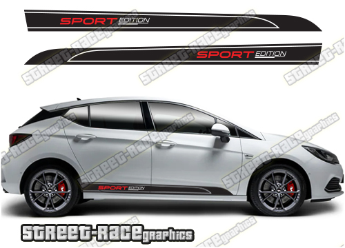 Vauxhall / Opel Astra racing stripes. They are a universal fit to suit all Vauxhall / Opel Astra cars and facelift variants. There are no cutouts for the wheel arches or door lines; these will require trimming during fitting.