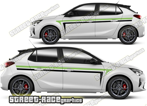 Vauxhall / Opel Corsa graphics. These large race-inspired decals are perfect for both street, rally and track-day cars. They are a universal fit to suit all Vauxhall / Opel Corsa cars and facelift variants from MK1 onwards. There are no cutouts for the door handles, wheel arches or door lines; these will require trimming during fitting.