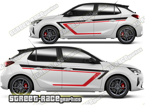 Vauxhall / Opel Corsa graphics. These large race-inspired decals are perfect for both street, rally and track-day cars. They are a universal fit to suit all Vauxhall / Opel Corsa cars and facelift variants from MK1 onwards. There are no cutouts for the door handles, wheel arches or door lines; these will require trimming during fitting.