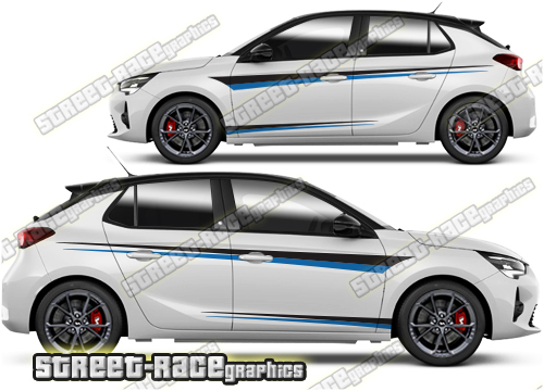 Vauxhall / Opel Corsa graphics. These large race-inspired decals are perfect for both street, rally and track-day cars. They are a universal fit to suit all Vauxhall / Opel Corsa cars and facelift variants from MK1 onwards. There are no cutouts for the door handles, wheel arches or door lines; these will require trimming during fitting.