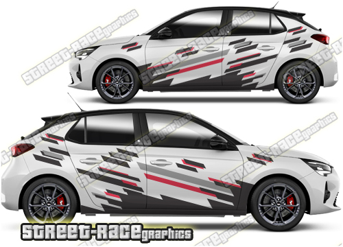 Vauxhall / Opel Corsa graphics. These large race-inspired decals are perfect for both street, rally and track-day cars. They are a universal fit to suit all Vauxhall / Opel Corsa cars and facelift variants from MK1 onwards. There are no cutouts for the door handles, wheel arches or door lines; these will require trimming during fitting.