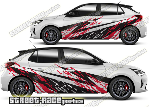 Vauxhall / Opel Corsa graphics. These large race-inspired decals are perfect for both street, rally and track-day cars. They are a universal fit to suit all Vauxhall / Opel Corsa cars and facelift variants from MK1 onwards. There are no cutouts for the door handles, wheel arches or door lines; these will require trimming during fitting.