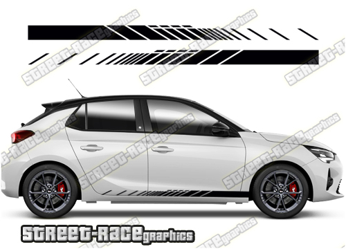 Vauxhall / Opel Corsa racing stripes. They are a universal fit to suit all Vauxhall / Opel Corsa cars and facelift variants. There are no cutouts for the wheel arches or door lines; these will require trimming during fitting.