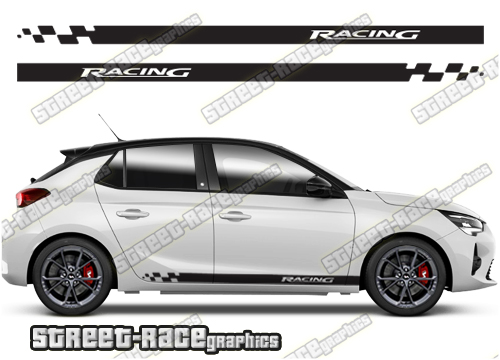 Vauxhall / Opel Corsa racing stripes. They are a universal fit to suit all Vauxhall / Opel Corsa cars and facelift variants. There are no cutouts for the wheel arches or door lines; these will require trimming during fitting.