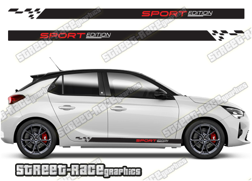 Vauxhall / Opel Corsa racing stripes. They are a universal fit to suit all Vauxhall / Opel Corsa cars and facelift variants. There are no cutouts for the wheel arches or door lines; these will require trimming during fitting.