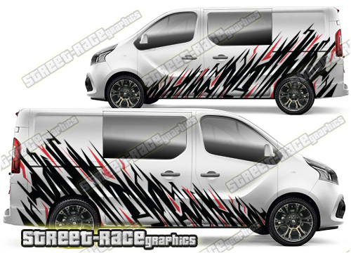 Vauxhall / Opel Vivaro large side graphics. Great for a camper or race van conversion. They are a universal fit to suit all Vauxhall / Opel Vivaro vans and facelift variants from MK2 onwards. There are no cutouts for the door handles, wheel arches or door lines, these will require trimming during fitting. Shown on the short wheelbase (SWB) Vivaro van, but we can also make them to fit the long wheelbase (LWB).