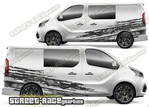 Vauxhall / Opel Vivaro large side graphics. Great for a camper or race van conversion. They are a universal fit to suit all Vauxhall / Opel Vivaro vans and facelift variants from MK2 onwards. There are no cutouts for the door handles, wheel arches or door lines, these will require trimming during fitting. Shown on the short wheelbase (SWB) Vivaro van, but we can also make them to fit the long wheelbase (LWB).