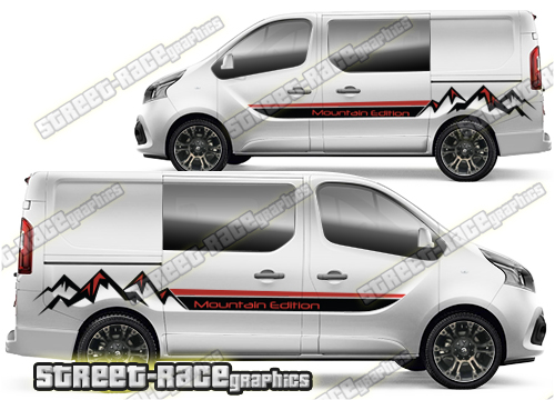 Vauxhall / Opel Vivaro large side graphics. Great for a camper or race van conversion. They are a universal fit to suit all Vauxhall / Opel Vivaro vans and facelift variants from MK2 onwards. There are no cutouts for the door handles, wheel arches or door lines, these will require trimming during fitting. Shown on the short wheelbase (SWB) Vivaro van, but we can also make them to fit the long wheelbase (LWB).