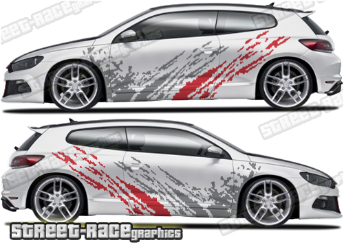 Volkswagen Scirocco graphics. These large race-inspired decals are perfect for both street, rally and track-day cars. They are a universal fit to suit all Volkswagen Scirocco cars and facelift variants from MK3 onwards. There are no cutouts for the door handles, wheel arches or door lines; these will require trimming during fitting.