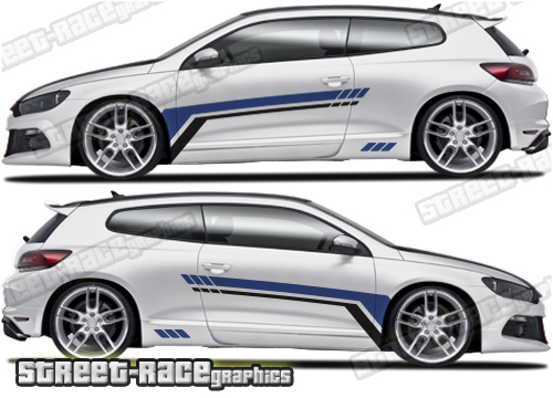 Volkswagen Scirocco graphics. These large race-inspired decals are perfect for both street, rally and track-day cars. They are a universal fit to suit all Volkswagen Scirocco cars and facelift variants from MK3 onwards. There are no cutouts for the door handles, wheel arches or door lines; these will require trimming during fitting.