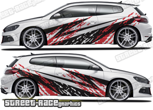 Volkswagen Scirocco graphics. These large race-inspired decals are perfect for both street, rally and track-day cars. They are a universal fit to suit all Volkswagen Scirocco cars and facelift variants from MK3 onwards. There are no cutouts for the door handles, wheel arches or door lines; these will require trimming during fitting.