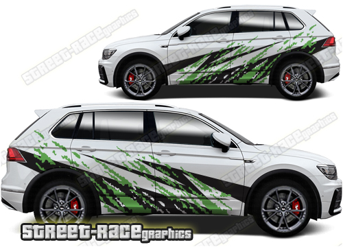 Volkswagen T-Cross graphics. They are shown on the first generation T-Cross but they can be trimmed to fit all later versions and facelift variants. The decals are not pre-cut for any specific Volkswagen T-Cross version; they do not have any door handle cutouts, wheel arch or door line splits. These will require trimming during fitting. Vinyl will not stick to unpainted textured plastics.
