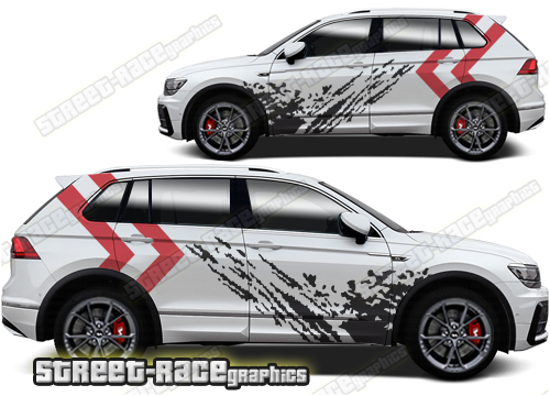 Volkswagen T-Cross graphics. They are shown on the first generation T-Cross but they can be trimmed to fit all later versions and facelift variants. The decals are not pre-cut for any specific Volkswagen T-Cross version; they do not have any door handle cutouts, wheel arch or door line splits. These will require trimming during fitting. Vinyl will not stick to unpainted textured plastics.