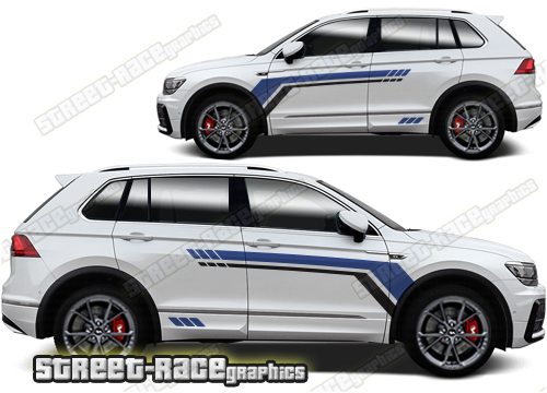 Volkswagen T-Cross graphics. They are shown on the first generation T-Cross but they can be trimmed to fit all later versions and facelift variants. The decals are not pre-cut for any specific Volkswagen T-Cross version; they do not have any door handle cutouts, wheel arch or door line splits. These will require trimming during fitting. Vinyl will not stick to unpainted textured plastics.