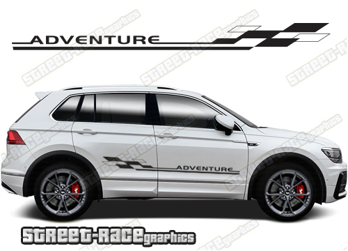 Volkswagen T-Cross racing stripes. They are shown on the first generation T-Cross but they can be trimmed to fit all later versions and facelift variants. The decals are not pre-cut for any specific Volkswagen T-Cross version; they do not have any door handle cutouts, wheel arch or door line splits. These will require trimming during fitting. Vinyl will not stick to unpainted textured plastics.