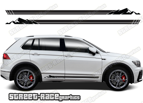 Volkswagen T-Cross racing stripes. They are shown on the first generation T-Cross but they can be trimmed to fit all later versions and facelift variants. The decals are not pre-cut for any specific Volkswagen T-Cross version; they do not have any door handle cutouts, wheel arch or door line splits. These will require trimming during fitting. Vinyl will not stick to unpainted textured plastics.