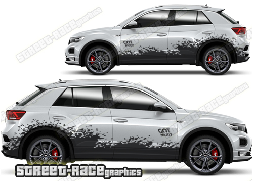 Volkswagen T-Roc graphics. They are shown on the first generation T-Roc but they can be trimmed to fit all later versions and facelift variants. The decals are not pre-cut for any specific Volkswagen T-Roc version; they do not have any door handle cutouts, wheel arch or door line splits. These will require trimming during fitting. Vinyl will not stick to unpainted textured plastics.