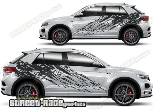 Volkswagen T-Roc graphics. They are shown on the first generation T-Roc but they can be trimmed to fit all later versions and facelift variants. The decals are not pre-cut for any specific Volkswagen T-Roc version; they do not have any door handle cutouts, wheel arch or door line splits. These will require trimming during fitting. Vinyl will not stick to unpainted textured plastics.