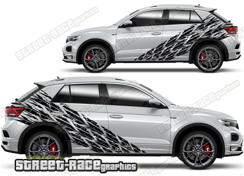 Volkswagen T-Roc graphics. They are shown on the first generation T-Roc but they can be trimmed to fit all later versions and facelift variants. The decals are not pre-cut for any specific Volkswagen T-Roc version; they do not have any door handle cutouts, wheel arch or door line splits. These will require trimming during fitting. Vinyl will not stick to unpainted textured plastics.