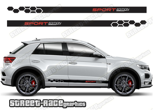 Volkswagen T-Roc racing stripes. They are shown on the first generation T-Roc but they can be trimmed to fit all later versions and facelift variants. The decals are not pre-cut for any specific Volkswagen T-Roc version; they do not have any door handle cutouts, wheel arch or door line splits. These will require trimming during fitting. Vinyl will not stick to unpainted textured plastics.
