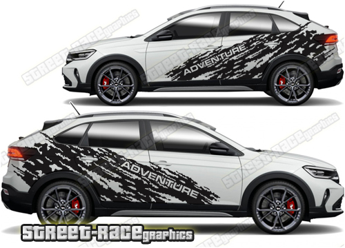 Volkswagen Taigo graphics. They are shown on the first generation Taigo but they can be trimmed to fit all later versions and facelift variants. The decals are not pre-cut for any specific Volkswagen Taigo version; they do not have any door handle cutouts, wheel arch or door line splits. These will require trimming during fitting. Vinyl will not stick to unpainted textured plastics.