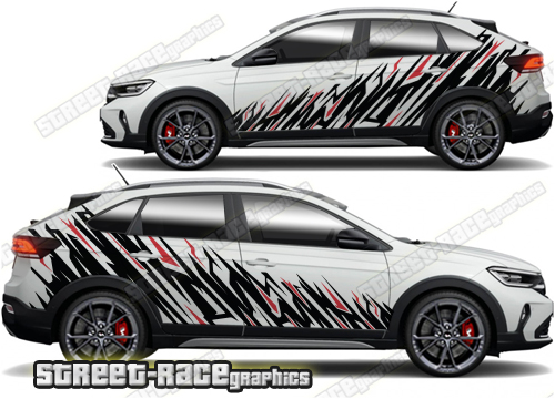 Volkswagen Taigo graphics. They are shown on the first generation Taigo but they can be trimmed to fit all later versions and facelift variants. The decals are not pre-cut for any specific Volkswagen Taigo version; they do not have any door handle cutouts, wheel arch or door line splits. These will require trimming during fitting. Vinyl will not stick to unpainted textured plastics.