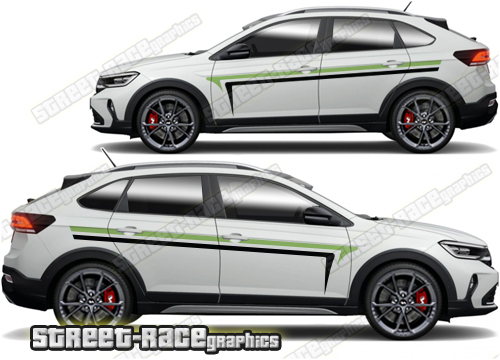 Volkswagen Taigo graphics. They are shown on the first generation Taigo but they can be trimmed to fit all later versions and facelift variants. The decals are not pre-cut for any specific Volkswagen Taigo version; they do not have any door handle cutouts, wheel arch or door line splits. These will require trimming during fitting. Vinyl will not stick to unpainted textured plastics.