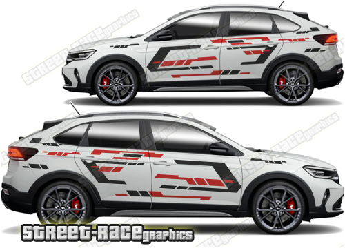 Volkswagen Taigo graphics. They are shown on the first generation Taigo but they can be trimmed to fit all later versions and facelift variants. The decals are not pre-cut for any specific Volkswagen Taigo version; they do not have any door handle cutouts, wheel arch or door line splits. These will require trimming during fitting. Vinyl will not stick to unpainted textured plastics.
