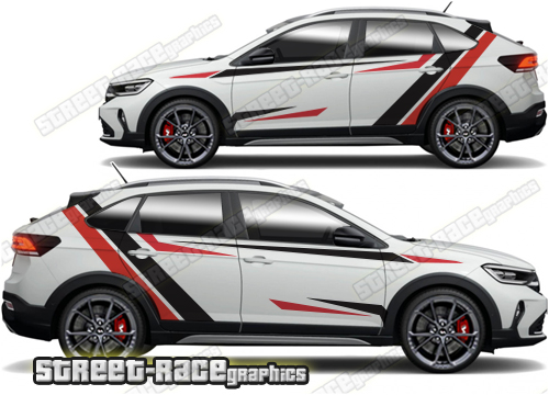 Volkswagen Taigo graphics. They are shown on the first generation Taigo but they can be trimmed to fit all later versions and facelift variants. The decals are not pre-cut for any specific Volkswagen Taigo version; they do not have any door handle cutouts, wheel arch or door line splits. These will require trimming during fitting. Vinyl will not stick to unpainted textured plastics.