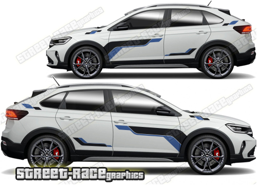 Volkswagen Taigo graphics. They are shown on the first generation Taigo but they can be trimmed to fit all later versions and facelift variants. The decals are not pre-cut for any specific Volkswagen Taigo version; they do not have any door handle cutouts, wheel arch or door line splits. These will require trimming during fitting. Vinyl will not stick to unpainted textured plastics.
