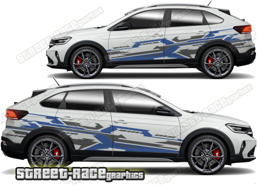 Volkswagen Taigo graphics. They are shown on the first generation Taigo but they can be trimmed to fit all later versions and facelift variants. The decals are not pre-cut for any specific Volkswagen Taigo version; they do not have any door handle cutouts, wheel arch or door line splits. These will require trimming during fitting. Vinyl will not stick to unpainted textured plastics.